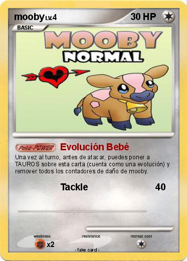 Una vez al turno, antes de atacar, puedes poner a TAUROS sobre esta carta (cuenta como una evolución) y remover todos los contadores de daño de mooby.
